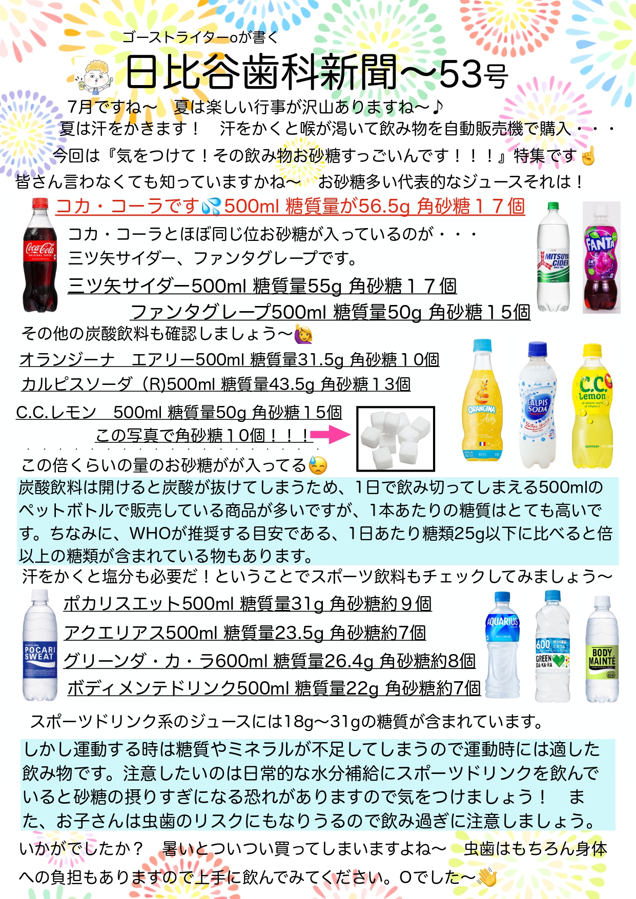HIBIYA DENTAL CLINIC 新聞 2024年7月号 2024.07.01 【ゴーストライターOの独り言】 今月は夏になると無性に飲みたくなる炭酸・スポーツ飲料についてです〜 コーラってお砂糖すごい入ってるんだよ〜という話はよく聞きますよね! コーラに歯漬けておいたら溶けちゃう〜なんて話も 笑 三ツ◯サイダーなんて透明だからそんなに入ってないよ〜なんて勝手に思ってましたが 確かに後味が甘ったるいですね・・・ これからの季節、外に出て汗を沢山かいた時は糖分もミネラルも不足してしまうのでしっかり飲んでくださいね! 飲んだら寝る前にはしっかり歯を磨きましょう〜